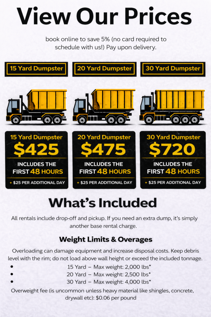 We cover landfill fees up to the first 2000 pounds or one ton on 15 yard bins! additional weight is just billed at six cents per pound. view our prices to see weight limits on different sizes